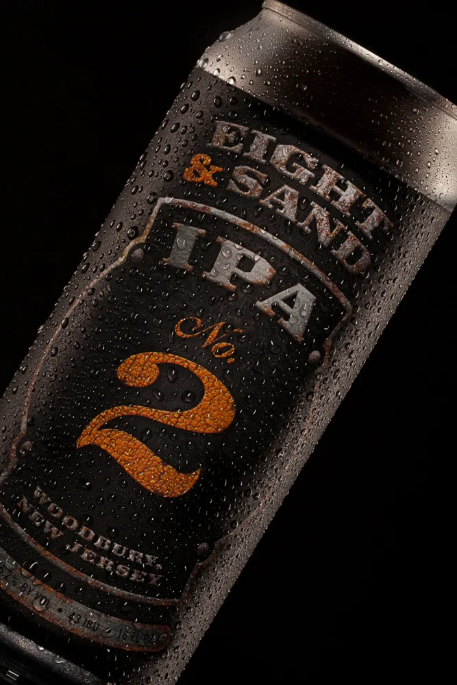 All the beer at Eight & Sand is named with railroad inspired names. The railroad played a big role in the development of the town. I wanted the lettering on the label to really pop for this photograph, so I went dark key for the image so the silver and gold graphics really stood out.